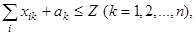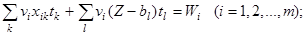 Кроме tk, tl и Тц управляемыми переменными в задаче являются общая численность бригады Z и число рабочих xik, занятых Ha i-м процессе в k-моперационном периоде цикла. При этом допускается перевод рабочих с выполнения одного процесса на другой, т.e. величины xikдля разных периодов времени протекания процесса могут меняться. При определении численности бригады следует иметь в виду, что в периоды l, когда ликвидируется отставание i-гo процесса, на его выполнение переводится вся бригада численностью Z за исключением необходимого звена рабочих bi, которые должны оставаться при комбайне.
