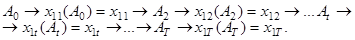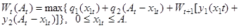 Необходимо втечение Т периодов времени (t=l,2,..., Т)распределить между двумя объединениями ресурсы в количестве A0.Ресурсы, вложенные в определенное объединение, к концу периода приносят прибыль, равную в первом объединении аво втором .Здесь и далее и - управляемые переменные задачи, обозначающие соответственно количество ресурсов, выделенное первому и второму объединениям в период t. В результате использования количество ресурсов постоянно уменьшается, в первом объединении до величины ,а во втором . По истечении каждого периода оставшееся количество ресурсов может быть вновь перераспределено между объединениями. Требуется распределить ресурсы между объединениями по периодам времени, т.e. найти количество ресурсов, выделяемое ежегодно (если плановый период - год) каждому объединению (объекту управления), чтобы суммарная прибыль была максимальна.
