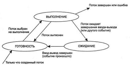 В течение своей жизни каждый поток переходит из одного состояния в другое в соответствии с алгоритмом планирования потоков, принятым в данной операционной системе.