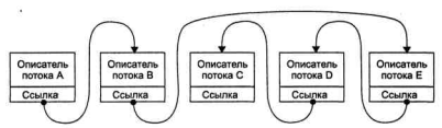 В состоянии выполнения в однопроцессорной системе может находиться не более одного потока, а в каждом из состояний ожидания и готовности – несколько потоков. Эти потоки образуют очереди соответственно ожидающих и готовых потоков. Очереди потоков организуются путем объединения в списки описателей отдельных потоков. Таким образом, каждый описатель потока, кроме всего прочего, содержит, по крайней мере, один указатель на другой описатель, соседствующий с ним в очереди. Такая организация очередей позволяет легко их переупорядочивать, включать и исключать потоки, переводить потоки из одного состояния в другое. Если предположить, что на рисунке 10.2 показана очередь готовых потоков, то запланированный порядок выполнения выглядит так: А, В, Е, D, С.