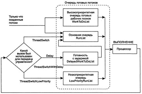 После того как выполнявшийся процессором поток завершит свой очередной цикл выполнения, отдав управление с помощью одного из вызовов передачи управления (или вызова ожидания на семафоре), планировщик выбирает для выполнения стоящий первым в очереди RunList поток и запускает его.
