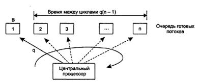 Если квант короткий, то суммарное время, которое проводит поток в ожидании процессора, прямо пропорционально времени, требуемому для его выполнения (то есть времени, которое потребовалось бы для выполнения этого потока при монопольном использовании вычислительной системы). Действительно, поскольку время ожидания между двумя циклами выполнения равно q(n-l), а количество циклов B/q, где В – требуемое время выполнения, то W=B(n-l). Эти соотношения представляют собой весьма грубые оценки, основанные на предположении, что В значительно превышает q. При этом не учитывается, что потоки могут использовать кванты не полностью, что часть времени они могут тратить на ввод-вывод, что количество потоков в системе может динамически меняться и т. д.