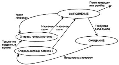 Потоки получают для выполнения квант времени, но некоторые из них используют его не полностью, например, из-за необходимости выполнить ввод или вывод данных. В результате возникает ситуация, когда потоки с интенсивными обращениями к вводу-выводу используют только небольшую часть выделенного им процессорного времени. Алгоритм планирования может исправить эту «несправедливость». В качестве компенсации за неиспользованные полностью кванты потоки получают привилегии при последующем обслуживании. Для этого планировщик создает две очереди готовых потоков (рисунок 11.3). Очередь образована потоками, которые пришли в состояние готовности в результате исчерпания кванта времени, а очередь 2 – потоками, у которых завершилась операция ввода-вывода. При выборе потока для выполнения, прежде всего, просматривается вторая очередь, и только если она пуста, квант выделяется потоку из первой очереди.