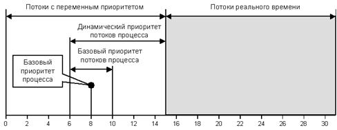 При создании процесса он в зависимости от класса получает по умолчанию базовый приоритет в верхней или нижней части диапазона. Базовый приоритет процесса в дальнейшем может быть повышен или понижен операционной системой. Первоначально поток получает значение базового приоритета из диапазона базового приоритета процесса, в котором он был создан. Пусть, например, значение базового приоритета некоторого процесса равно К. Тогда все потоки данного процесса получат базовые приоритеты из диапазона [К-2, К+2]. Отсюда видно, что, изменяя базовый приоритет процесса, ОС может влиять на базовые приоритеты его потоков.