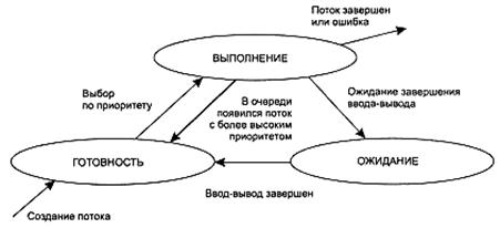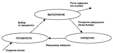 В обоих случаях выбор потока на выполнение из очереди готовых осуществляется одинаково: выбирается поток, имеющий наивысший приоритет. Однако проблема определения момента смены активного потока решается по-разному. В системах с относительными приоритетами активный поток выполняется до тех пор, пока он сам не покинет процессор, перейдя в состояние ожидания (или же произойдет ошибка, или поток завершится). На рисунок 11.5, показан граф состояний потока в системе с относительными приоритетами.
