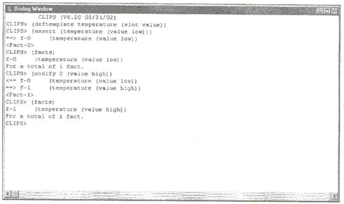 Аргументом <определение-факта> может быть либо переменная, связанная с адресом факта с помощью правила, либо индекс факта без префикса (например, 3 для факта с индексом f-3). После определения факта следует список из одного или более новых значений слотов указанного шаблона. Для использования приведенного выше примера его необходимо переделать следующим образом: