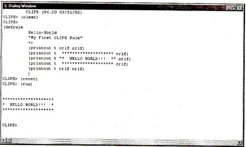 Функция reset, как уже упоминалось ранее, очищает список фактов и заносит в него факт (initial-fact), что очень важно для нормального функционирования нашей программы. И, наконец, функция run запускает механизм логического вывода и приводит нашу программу в движение. Если описанные выше действия были выполнены правильно, то вы должны увидеть результат, аналогичный приведенному на рис. 6.1 — фразу "hello world!!!" в красивой рамочке из звездочек: