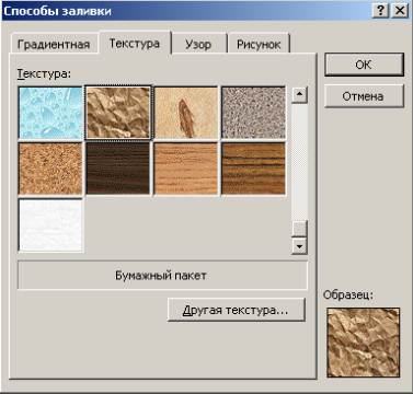 · Текстура (рис. 34.3). Для создания эффекта мраморной, деревянной или водной поверхности можно выбрать соответствующую текстуру во вкладке Текстура. Для импорта текстур, имеющихся на компьютере, надо щелкнуть на кнопке Другие текстуры в нижней части диалогового окна.