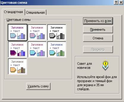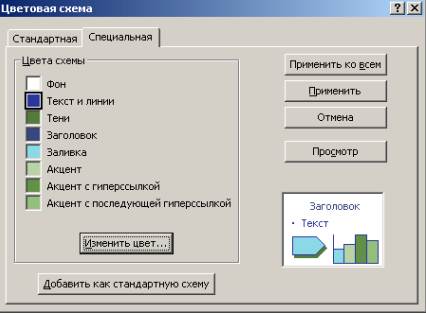 Чтобы выбрать цветовую схему надо щелкнуть на пункте меню Формат и выбрать команду Цветовая схема слайда. На экране появится диалоговое окно Цветовая схема (рис. 34.6), которое имеет две вкладки – Стандартная и Специальная.