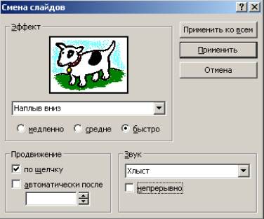 9. Щелкнуть на кнопке Применить, чтобы применить выбранный эффект к выбранному слайду (слайдам), или на кнопке Применить ко всем, чтобы использовать переход во всей презентации.