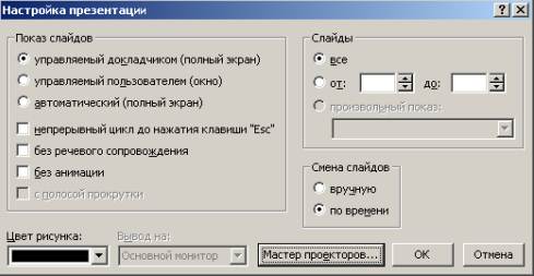 1. Как будет просматриваться презентация? В верхней половине окна Настройка презентации предлагается три варианта выбора представления презентации: