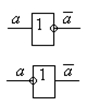 Это - наиболее простые элементы, имеющие один вход и один выход. Такие элементы описываются логической функцией отрицания, инверсии и называются просто функциями НЕ. На рис.1.3 приведены УГО элементов НЕ, рекомендуемые ГОСТом. Как видно, указатель инверсии допускается ставить либо по выходу, либо по входу логического элемента. Согласно ГОСТ можно не ставить метку основной функции «1» в основном поле УГО.