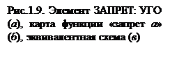 Эти двухвходовые элементы получили такое название потому, что сигнал по одному из входов «запрещает» либо «разрешает» прохождение на выход элемента сигнала, поданного на второй вход. Поэтому один вход называется входом запрета - он инверсный, а второй вход называют «информационным». Значения выходного сигнала совпадают со значениями входного информационного сигнала в состоянии разрешения, а в состоянии запрета выходной сигнал имеет значение лог.0 независимо от значения сигнала по информационному входу. В табл.1.3 показаны две функции запрета V1 (запрет b) и функция V4 (запрет а). На рис. 1.9 приведены УГО элемента «запрет а» (запрет по а), алгебраическое выражение и карта Карно функции с аналогичным названием и функциональная эквивалентная схема элемента.