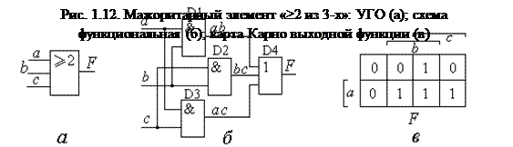 Этой формулой непосредственно описывается схема рис.1.12,б. Как видно по карте Карно (рис.1.12,в), единицы стоят в клетках, расположенных на областях единичных значений двух и всех трёх аргументов. По аналогии можно построить карту Карно для мажоритарного элемента «³3 из 5-ти», найти минимальное алгебраическое выражение его выходной функции, а затем построить функциональную схему.
