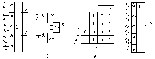 Таким образом, эта функция от 4-х аргументов, причём правая часть выражения (1.20) соответствует минимальной конъюнктивной нормальной форме функции F (МКНФ). Левая часть этого выражения непосредственно соответствует УГО элемента 2-2И-2ИЛИ-НЕ. Второй такой же элемент этой микросхемы имеет «нелогические» входы расширения по ИЛИ. Они помечены в левом дополнительном поле УГО метками «э» - эмиттера вывод и «к» - коллектора вывод. Нелогическими выводами (входы либо выходы) принято называть такие, на которых сигналы могут принимать значения нестандартных уровней напряжения. Такие выводы помечаются на УГО логических элементов (либо микросхем) специальным указателем в виде «крестика» ´. В частности, у рассматриваемых ИМС эти выводы выполнены от коллектора и эмиттера транзистора фазорасщепляющего каскада базового логического элемента серий ИМС ТТЛ. Подключая к ним выходы соответствующих ИМС «расширителей по ИЛИ», можно наращивать число входов элемента ИЛИ-НЕ, входящего в состав многофункционального элемента. Например, для рассматриваемых микросхем коэффициент объединения по входу равен 8, а расширители по ИЛИ реализуют логическое произведение нескольких входных сигналов. По существу расширители по ИЛИ являются многовходовыми элементами И с той лишь разницей, что выходные сигналы не имеют стандартных уровней лог.0 и лог.1. Отмеченное позволяет записать по аналогии с выражением (1.20) алгебраическое выражение выходной функции V для второго элемента: