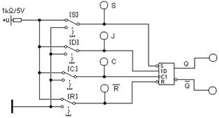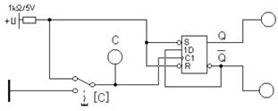 f)Соберите схему, изображенную на рис. Подавая на счетный вход С актовые импульсы с помощью ключа [С] и определяя состояние выходов триггера при помощи пробников, составьте и зарисуйте временные диаграммы работы триггера в счетном режиме.