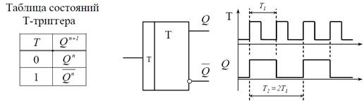 Как видно из диаграмм, Т-триггер делит частоту входных импульсов в 2 раза. Для получения больших значений коэффициента деления частоты применяется каскадное соединение Т-триггеров.