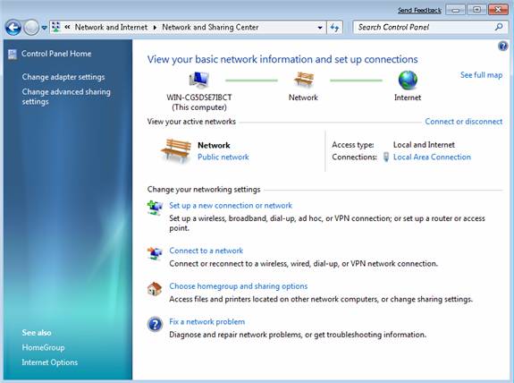 Рисунок 3: Центр управления сетями и общим доступом в Windows Vista