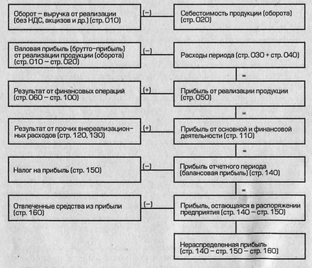 Рис. 1.3. Модель хозяйственного механизма предприятия, основанная на формировании прибыли (указаны строки формы № 2 отчетности за 1996 г.)