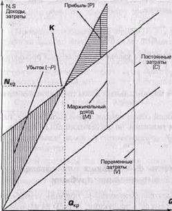 В прямоугольной системе координат строится график зависимости себестоимости (затрат) и дохода от количества единиц выпущенной продукции. По вертикали откладываются данные о себестоимости и доходе, по горизонтали - количество единиц продукции (рис. 8.3). В точке критического объема производства (К) нет прибыли и нет убытка. Справа от нее заштрихована область чистых прибылей (доходов). Для каждого значения Q (количества единиц продукции) чистая прибыль определяется как разность между величиной маржинального дохода и постоянных расходов.