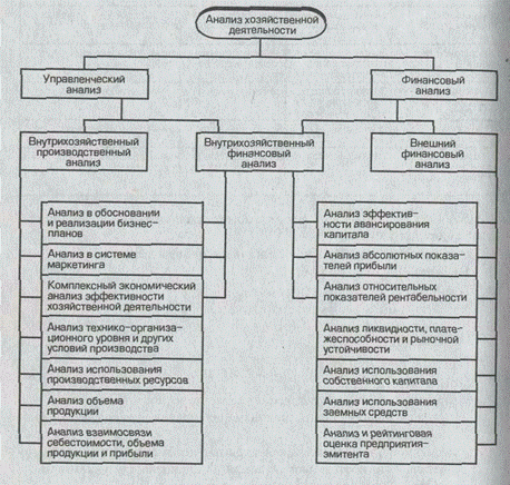 Разделение анализа на финансовый и управленческий обусловлено сложившимся на практике разделением системы бухгалтерского учета в масштабе предприятия на финансовый учет и управленческий учет. Это же порождает деление анализа на внешний и внутренний. Такое разделение анализа для самого предприятия является несколько условным, потому что внутренний анализ может рассматриваться как продолжение внешнего анализа и наоборот. В интересах дела оба вида анализа подпитывают друг друга основной информацией.