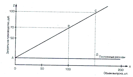 Графически уравнение затрат отображается прямой линией, проходящей через три характерные точки (рис. 10.2). На оси ординат (оси затрат на производство) линия проходит через точку, соответствующую величине постоянных расходов. Линия постоянных расходов параллельна оси абсцисс (оси объема производства). Линия затрат проходит также через точки пересечения максимального и минимального объемов производства с соответствующими значениями общих затрат на производство.