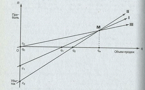 q - объем продаж; R - прибыль; с - постоянные затраты; I, II, III - варианты производства; qм — объем продаж, дающий равную прибыль по всем вариантам