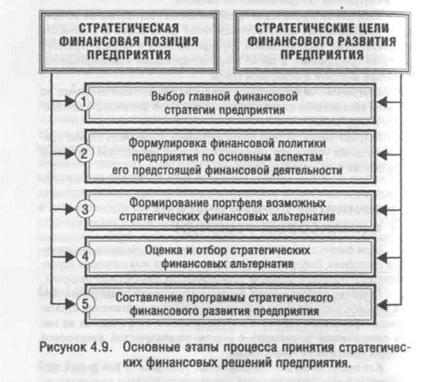 Исходя из стратегической финансовой позиции и стратегических целей финансового развития предприятия процесс принятия стратегических финансовых решений осуществляется по следующим основным этапам (рис. 4.9):