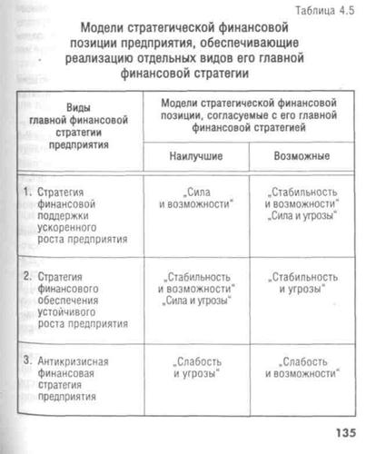 Как видно из приведенной таблицы, отдельные виды главной финансовой стратегии предприятия могут избираться при различных моделях его стратегической финансовой позиции (но в рамках определенного их диапазона). Конкретная взаимосогласованность этих параметров определяется с учетом степени проявления факторов внешней и внутренней среды предприятия в предстоящем периоде в рамках каждой модели стратегической финансовой позиции предприятия.