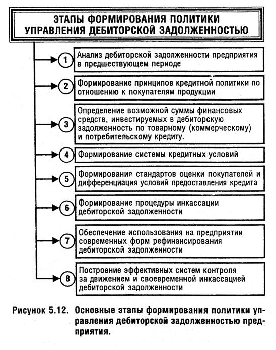формирование политики управления дебиторской задолженностью предприятия (или его кредитной политики по отношению к покупателям продукции) осуществляется по следующим основным этапам (рис. 5.12.).