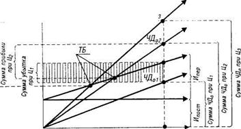На графике представлено три варианта формирования суммы чистого операционного дохода в зависимости от трех значений уровня цен на реализуемую продукцию: Щ, Цг, Цз (объем реализации продукции в натуральном выражении — Рф — при всех трех вариантах остается неизменным).