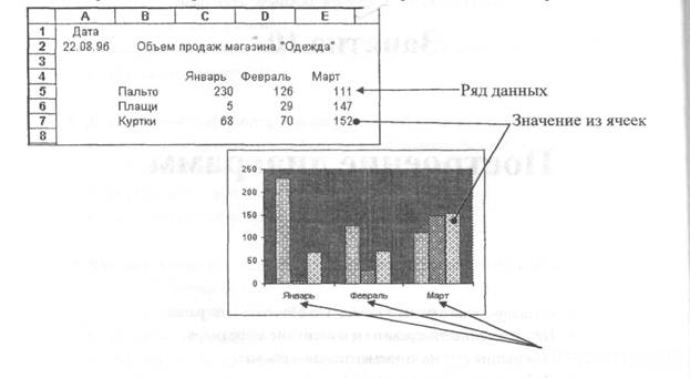 Диаграмма- это графическое представление данных рабочего листа. Данные, представленные в виде диаграммы, нагляднее и поэтому проще для сравнения. Значения из ячеек рабочего листа отображаются на диаграмме в виде столбцов, секторов, точек, линий или других маркеров данных. Маркеры данных одного цвета относятся к одному ряду данных. Ряд данных — это множество значений, которые можно отобразить на диаграмме. Элементы ряда данных располагаются на диаграмме по категориям. Категории задают положение конкретных значений в ряде данных.