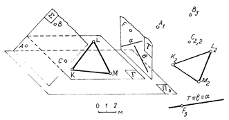2) Плоскость T пересекает плоскость S. Выше говорилось, что такое сечение называется разрезом. Линия пересечения m определяется точками B и C, а ее проекция на плане совпадает с проекцией прямой m и плоскости T: T º m º n.