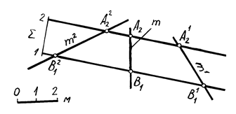 1) Проинтерполировав прямую m, определяют заложение искомой плоскости S.