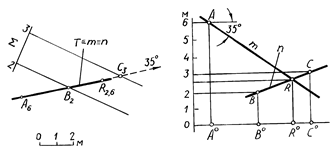 Точку пересечения прямой m (N10 Ð35°) с вертикальной плоскостью T определяют на плане пересечением их проекций, а числовую отметку – интерполированием прямой m (рис.3.23).