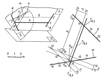 На рис.3.8 рассматривается случай, когда поверхность, ограничивающая слой горной породы, определена двумя видимыми падениями m и n. Видимым падением слоя в геологии называют всякое направление на его поверхности, не совпадающее с направлением истинного падения. Истинное падение определяется линией падения плоскости. Поверхность слоя приравниваем к плоскости, заданной на плане двумя пересекающимися прямыми - L (mìün).