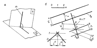 Таким образом, у прямой, перпендикулярной к плоскости, проекция на плане перпендикулярна к проекциям горизонталей плоскости, заложение обратно по величине заложению плоскости, падения у прямой и плоскости направлены в противоположные стороны: пр. m^пр. hS, lm= 1/lS, пад. D.