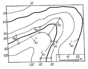 На рис. 6.2 топографическая поверхность пересекается с горизонтальными плоскостями Г1 и Г2, отметки которых соответственно равны 60 и85 м. Линиями пересечения указанных плоскостей с топографической поверхностью будут горизонтали h1 и h2 с отметками 60 и 85 м.