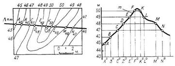 На рис. 6.3 дан пример построения истинного вида линии пересечения топографической поверхности с вертикальной плоскостью Λ. Искомую линию m определяют точками А, В, С, …..,N пересечения горизонталей топографической поверхности с секущей плоскостью Λ. На плане проекция кривой выражается в прямую линию, совпадающую с проекцией плоскости: m=Λ. Профиль кривой m построен с учетом расположения на плане проекций ее точек, а также их высотных отметок: |A45B46|=|A0B0|, |B46C47|=|B0C0| и т.д.