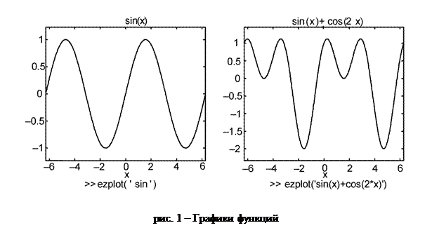 В тулбоксе SYMBOLIC есть два удобных средства для построения графиков, они вызываются командами ezplot и funtool. Имя первой из них читается как ‘easy plot’, она предназначена для построения графиков функций, заданных аналитически. На рис.1 приведен пример ее использования для построения графика синуса и функции y= sin x+ cos2x.