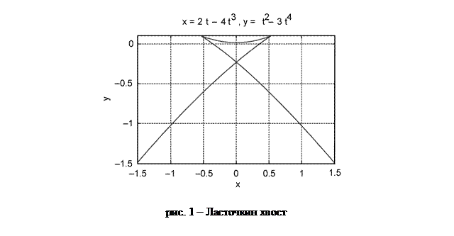 Для изображения функций, заданных параметрически, x = f (t), y = g(t) , команда вызывается в формате ezplot('f(t)', 'g(t)', [t0,t1]). Пусть, например, требуется нарисовать на плоскости (x, y) кривую, заданную уравнениями: x= 2t – 4t3, y = t2 – 3t4.