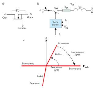 Модель MOSFET-транзистора состоит из резистора Ron, индуктивности Lon и ключа SW, включенных последовательно (рис. 6,а и 6б). Работой ключа управляет блок логики. Включение прибора происходит при положительном напряжении «сток-исток» и положительном сигнале (g > 0) на затворе. Выключается прибор при уменьшении сигнала на затворе до нуля (g= 0). В случае отрицательного напряжения «сток-исток» транзистор находится в выключенном состоянии, а ток проходит через обратный диод. В модели параллельно самому прибору включена демпфирующая цепь из последовательно соединенных резистора и конденсатора. На рис. 6в представлены статические вольтамперные характеристики модели полевого транзистора MOSFETдля включенного и выключенного состояний.