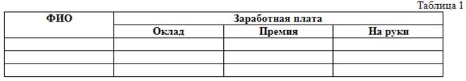Заполните таблицу хотя бы одним данным и сделайте расчет суммы, выдаваемой на руки (оклад +премия)- подоходной налог.