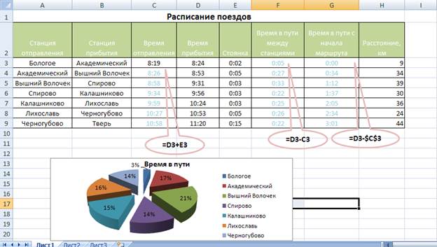 Задание 1. Постройте следующую таблицу в Microsoft Excel 2007, произведите необходимые расчеты. Время в пути проиллюстрируйте круговой диаграммой (3 балла).