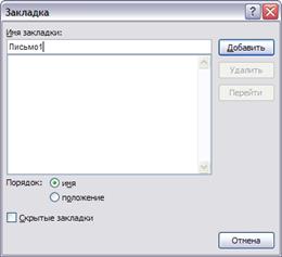 6. После первого письма поместите закладку (меню Вставка инструмент Закладка)с именем «Письмо1» (рис. 4). При установке закладки проследите за положением курсора на странице, так как позже будет произведен возврат в место закладки из другой части документа.