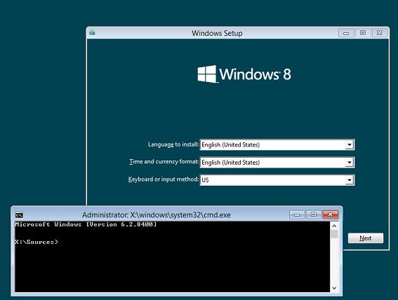 Вставляем установочный диск (или флешку) с Windows 8 в компьютер, в BIOS-е указываем загрузку с данного устройства и сохраняем изменения. После перезагрузки компьютера стартует установщик Windows 8. Когда загрузка дойдет до первого диалогового окна (выбор языка установки Win 8 и раскладки клавиатуры) необходимо нажать комбинацию клавиш Shift+F10, в результате чего должно открыться окно командной строки.