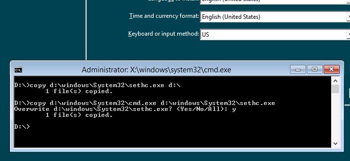 copy d:\sethc.exe d:\windows\system32\sethc.exe