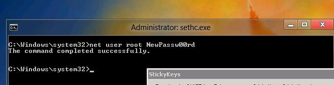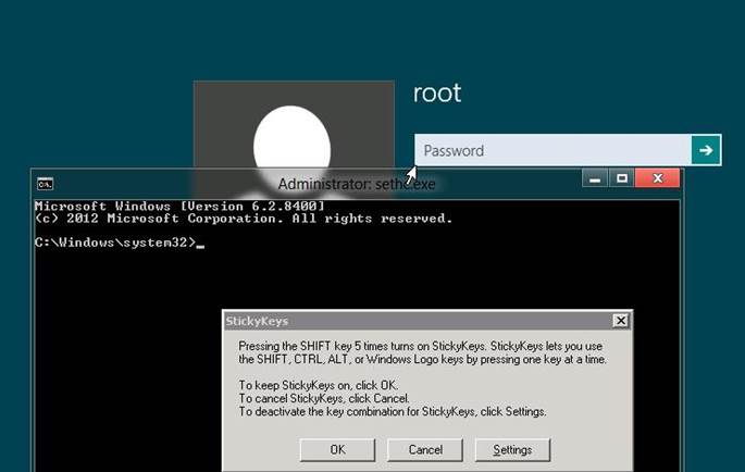 Вкратце напомним, в чем суть методики. В системе подменяется файл sethc.exe на файл cmd.exe. Затем при загрузке Windows при пятикратном нажатия клавиши Shift должна запуститься подпрограмма, включающая залипание клавиш (та самая утилита sethc.exe). А так как мы заменили ее на файл запуска командной строки, то откроется именно окно командной строки, запущенное с правами SYSTEM, а это означает, что мы можем выполнить любую операцию в Windows без необходимости авторизации. В данном случае, мы просто изменим пароль администратора Windows 8.