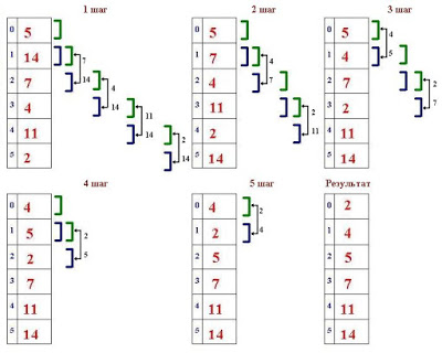 arr[6]={5,14,7,4,11,2}; // массив для сортировки