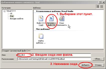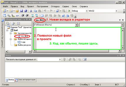 В появившемся окне выбираем тип файла «Заголовочный файл (.h)», вводим имя заголовочного файла и нажимаем кнопку «Добавить». После этого в окне основного проекта, во вкладке обозреватель решения у вас появится новый файл. В примере на рисунке это файл my_lib.h. Кроме того, появится дополнительная вкладка в редакторе.